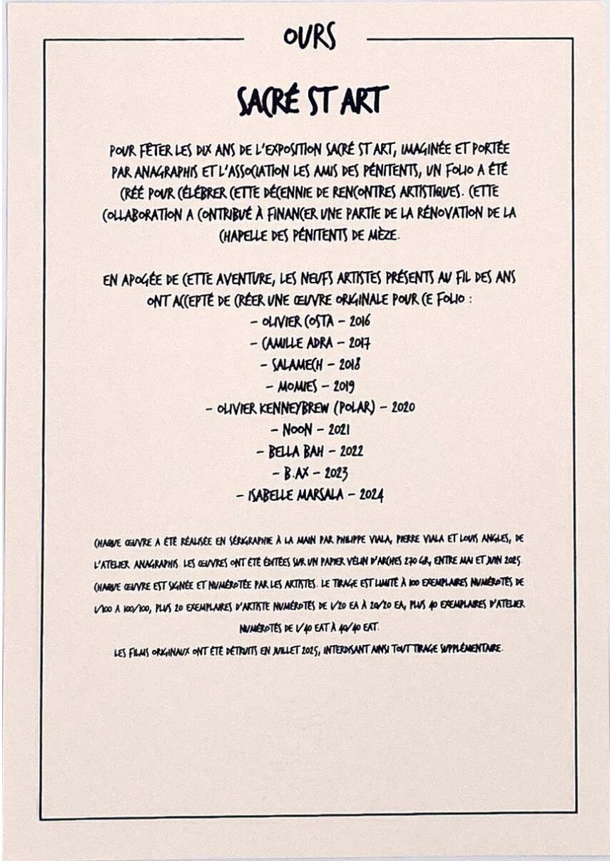 Folio édité pour célébrer les dix ans des expositions SACRE SAINT ART organisées par l’Association Les Amis des Pénitents en partenariat avec les Éditions Anagraphis. De 2016 à 2024, neuf artistes ont marqué la chapelle de leur empreinte :Olivier Costa, Camille Adra, Salamech, Momies, Olivier Kenneybrew,